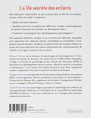 Edouard Gentaz La vie secrète des enfants: Comprendre son enfant pour mieux accompagner son développement pdf download - La vie secrète des enfants: Comprendre son enfant pour mieux accompagner son développement a été écrit par Edouard Gentaz qui connu comme un auteur et ont écrit beaucoup de livres intéressants avec une grande narration. La vie secrète des enfants: Comprendre son enfant pour mieux accompagner son développement a été l'un des livres de populer sur 2016. Il contient 207 pages et disponible sur format . Ce livre a été très surpris en raison de sa note rating et a obtenu environ avis des utilisateurs. Donc, après avoir terminé la lecture de ce livre, je recommande aux lecteurs de ne pas sous-estimer ce grand livre. Vous devez prendre La vie secrète des enfants: Comprendre son enfant pour mieux accompagner son développement que votre liste de lecture ou vous serez regretter parce que vous ne l'avez pas lu encore dans votre vie.Rang parmi les ventes Amazon: #73025 dans LivresPublié le: 2016-09-21Langue d'origine: FrançaisDimensions: 7.68" h x .47" l x 5.91" L, Reliure: Broché207 pagesPrésentation de l'éditeurDes clefs pour comprendre ce qui se passe dans la tête de nos enfants,et pour mieux les aider à s’épanouir.• Quels sont leurs besoins ?• Quelles sont leurs compétences (affectives, sociales, neurocognitiveset sensori-motrices) et comment se développent-elles ?• Comment accompagner leur développement psychologique ?Des questions brûlantes, simples ou au contraire plus délicates, auxquellessont apportées des réponses claires, scientifiques et accessibles à tous,parents, grands-parents, étudiants, professionnels de la petite enfance outoute personne désireuse de mieux comprendre les comportements del’enfant, à cet âge où tout se met en place.Biographie de l'auteurÉdouard Gentaz est professeur de psychologie du développement à l’Universitéde Genève et directeur de recherches au CNRS (LPNC-Grenoble). Ildirige, à la faculté de psychologie et des sciences de l’éducation (FPSE), le laboratoiredu développement sensori-moteur, affectif et social de la naissance àl’adolescence. Il est l’auteur de L’Enfant prématuré (avec Fleur Lejeune) et coauteurd’Apprendre à lire (sous la direction de Stanislas Dehaene).Léonard Vannetzel est psychologue, spécialisé en psychologie de l’enfant et enneuropsychologie. Rédacteur en chef adjoint de la revue ANAE et responsabled’ANAE Formations, il est aussi conférencier et a enseigné dans plusieurs universitésparisiennes